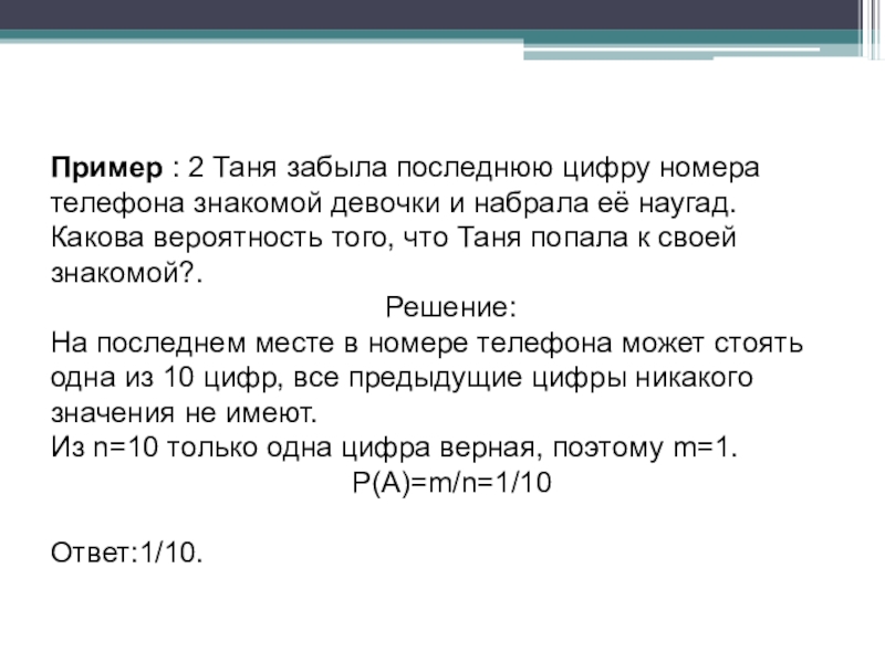 Слайд 11Пример : 2 Таня забыла последнюю цифру номера телефона знакомой девочки