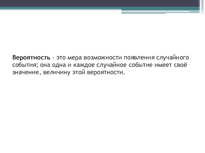 Слайд 9Вероятность - это мера возможности появления случайного события; она одна и