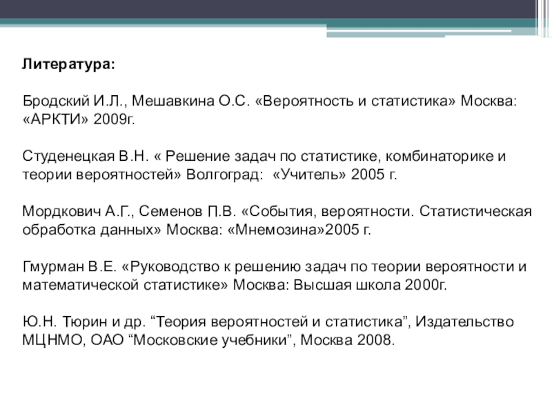 Бродский И.Л., Мешавкина О.С. «Вероятность и статистика» Москва:«АРКТИ» 2009г.