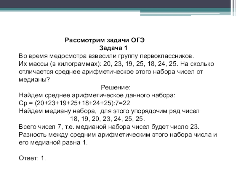 Их массы (в килограммах): 20, 23, 19, 25, 18, 24, 25. На сколько отличается среднее арифметическое этого набора чисел от медианы?