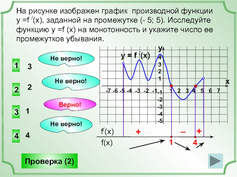 На рисунке изображен график функции у =f(x), заданной на промежутке [-5;5]. Укажите точку, в которой производная равна 0.