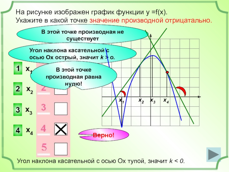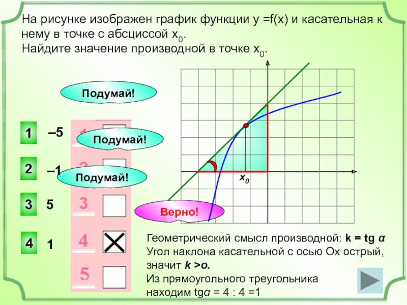 Угол наклона касательной с осью Ох равен 0 (касательная параллельна оси Ох, значит tg00 = 0
