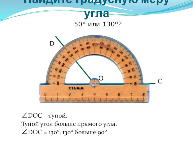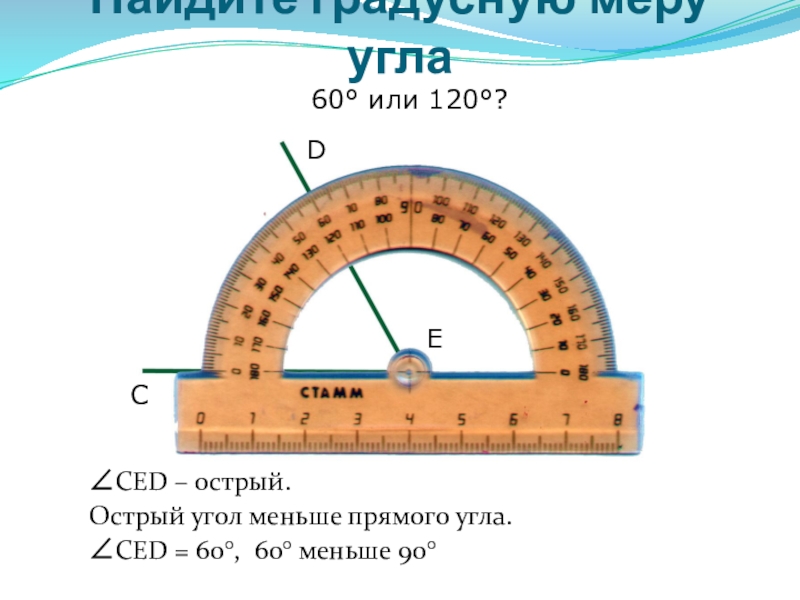 3. Выбрать соответствующую шкалу и определить, через какое деление проходит вторая сторона угла.