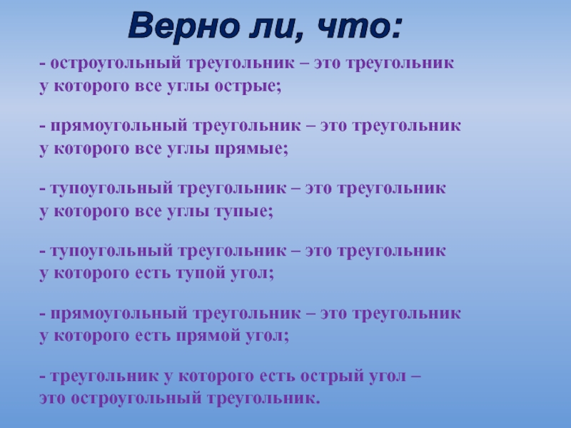 - тупоугольный треугольник – это треугольник у которого все углы тупые;