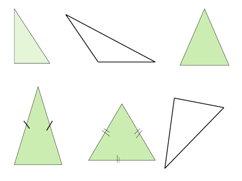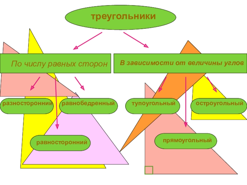 треугольникиПо числу равных сторонВ зависимости от величины угловразностороннийравнобедренныйравностороннийтупоугольныйостроугольныйпрямоугольный