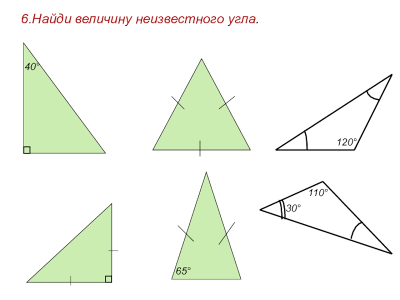 6.Найди величину неизвестного угла.40°120°65°110°30°