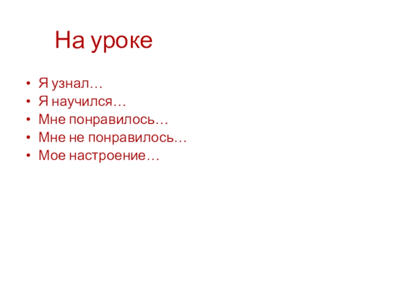 На урокеЯ узнал…Я научился…Мне понравилось…Мне не понравилось…Мое настроение…