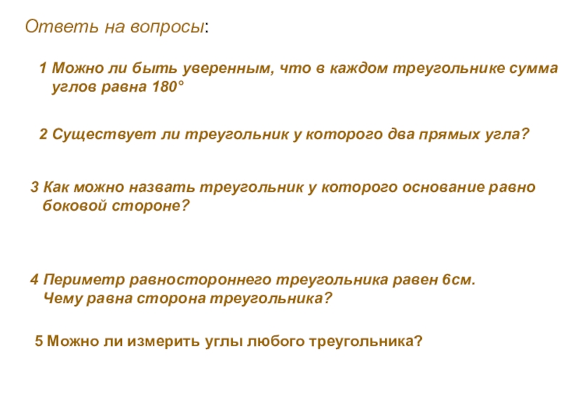 Ответь на вопросы:1 Можно ли быть уверенным, что в каждом треугольнике сумма  углов равна 180°5 Можно