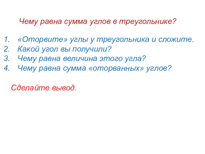Чему равна сумма углов в треугольнике?«Оторвите» углы у треугольника и сложите.Какой угол вы получили?Чему равна величина этого