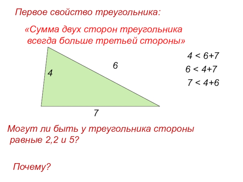 Первое свойство треугольника:«Сумма двух сторон треугольника всегда больше третьей стороны»4674 < 6+76 < 4+77 < 4+6Могут ли