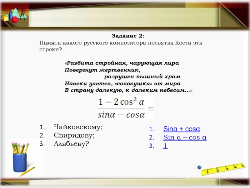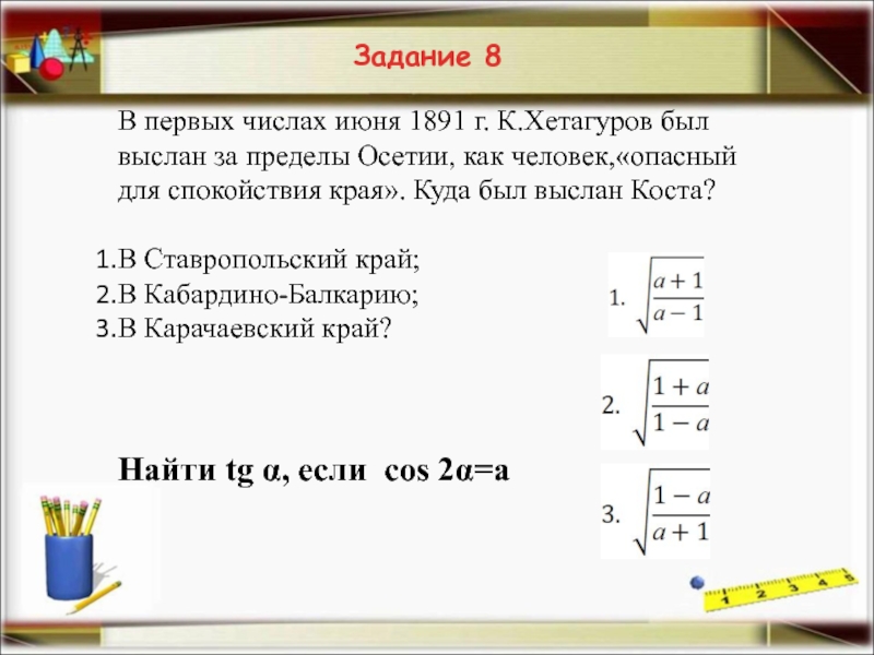 Найти tg α, если cos 2α=а