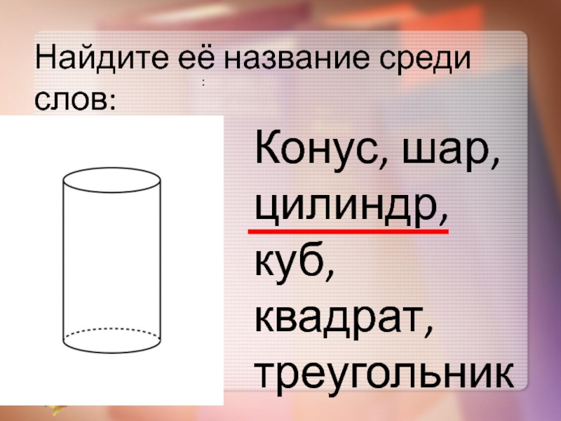 :Найдите её название среди слов:Конус, шар, цилиндр, куб, квадрат, треугольник