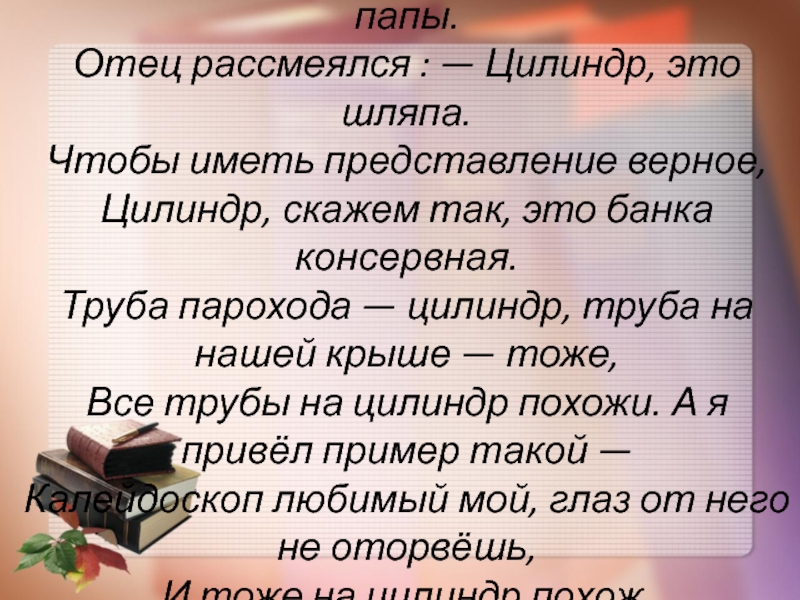 — Цилиндр, это шляпа. Чтобы иметь представление верное, Цилиндр, скажем так, это банка консервная. Труба парохода — цилиндр, труба на нашей крыше — тоже, Все трубы на цилиндр похожи. А я привёл пример такой — Калейдоскоп любимый мой, глаз от него не оторвёшь, И тоже на цилиндр похож.