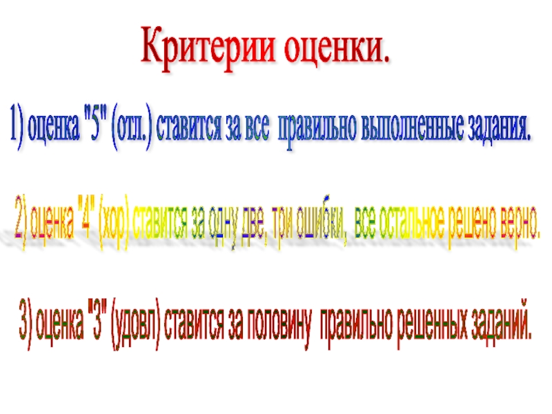 3) оценка "3" (удовл) ставится за половину правильно решенных заданий.