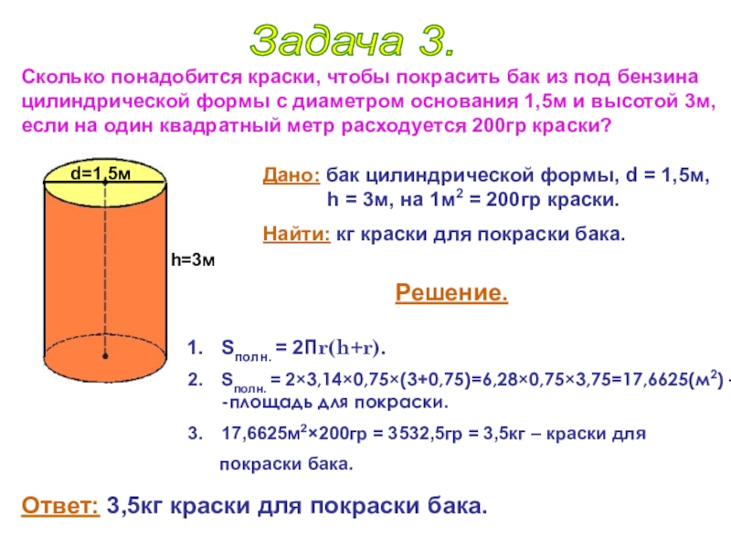 Дано: бак цилиндрической формы, d = 1,5м, h = 3м, на 1м2 = 200гр краски.