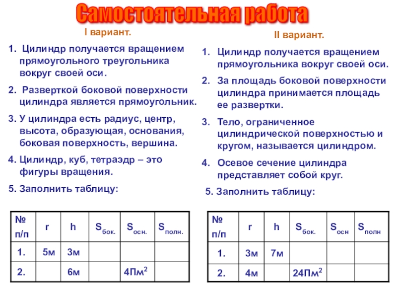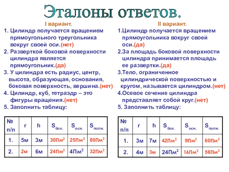Sбок. = 2Πrh. Sосн. = Πr2.