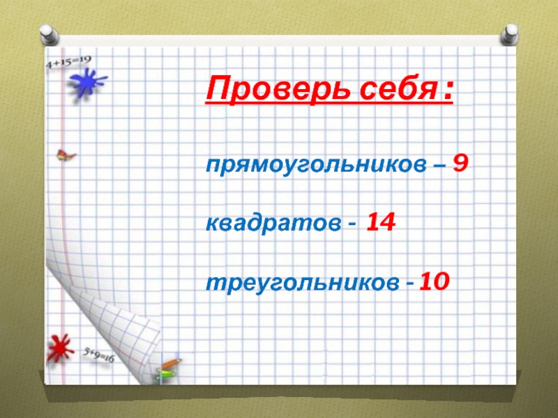 Проверь себя : прямоугольников – 9квадратов - 14 треугольников - 10