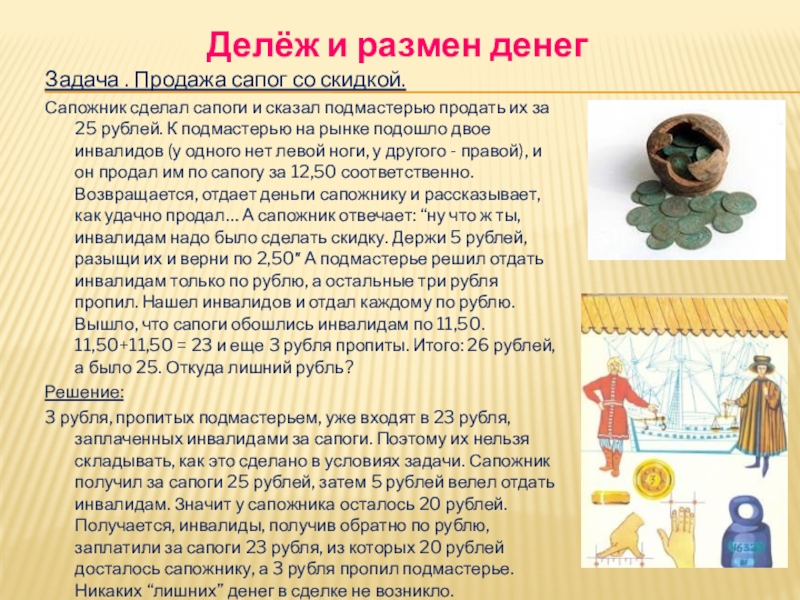 сапоги и сказал подмастерью продать их за 25 рублей. К подмастерью на рынке подошло двое инвалидов (у одного нет левой ноги, у другого - правой), и он продал им по сапогу за 12,50 соответственно. Возвращается, отдает деньги сапожнику и рассказывает, как удачно продал… А сапожник отвечает: “ну что ж ты, инвалидам надо было сделать скидку. Держи 5 рублей, разыщи их и верни по 2,50″ А подмастерье решил отдать инвалидам только по рублю, а остальные три рубля пропил. Нашел инвалидов и отдал каждому по рублю. Вышло, что сапоги обошлись инвалидам по 11,50. 11,50+11,50 = 23 и еще 3 рубля пропиты. Итого: 26 рублей, а было 25. Откуда лишний рубль?