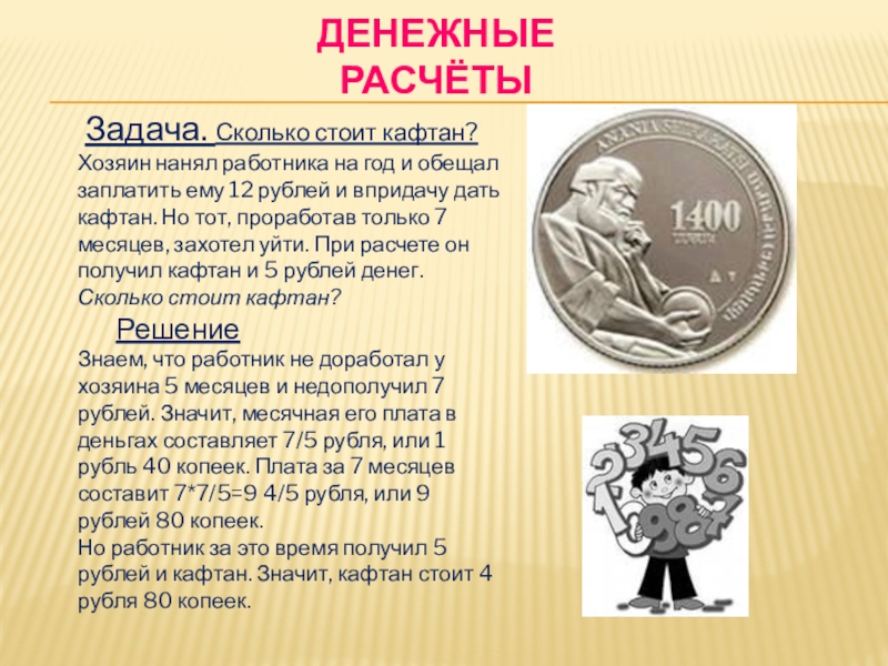 Задача. Сколько стоит кафтан? Хозяин нанял работника на год