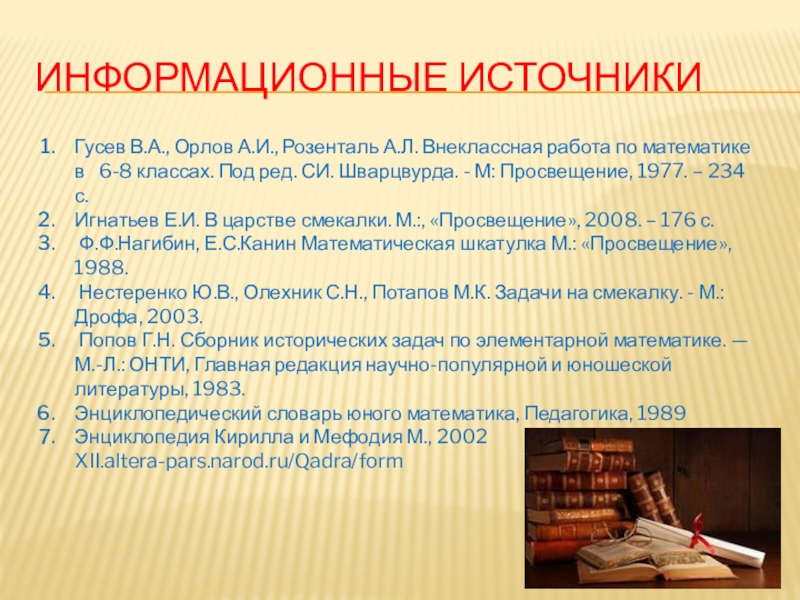 Нестеренко Ю.В., Олехник С.Н., Потапов М.К. Задачи на смекалку. - М.: Дрофа, 2003.