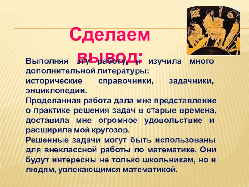 Проделанная работа дала мне представление о практике решения задач в старые времена, доставила мне огромное удовольствие и расширила мой кругозор.