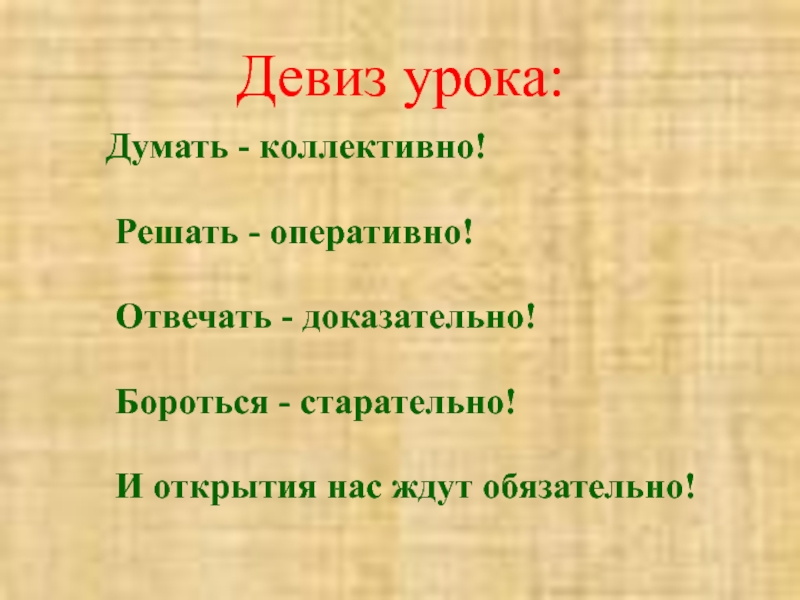 Девиз урока:Думать - коллективно! Решать - оперативно!  Отвечать - доказательно!  Бороться - старательно! И открытия нас ждут