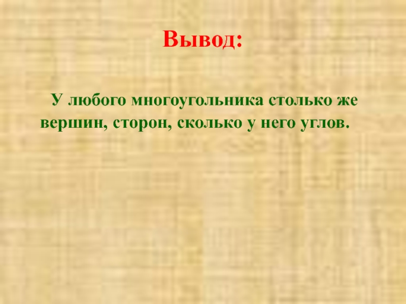 Вывод:   У любого многоугольника столько же вершин, сторон, сколько у него углов.