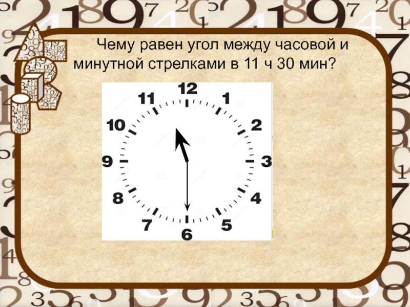 Слайд 5 Чему равен угол между часовой и минутной стрелками