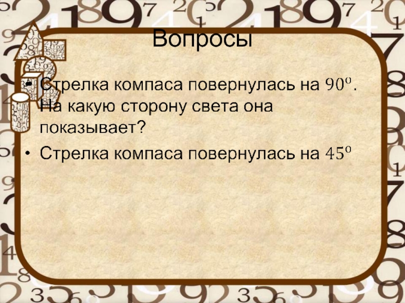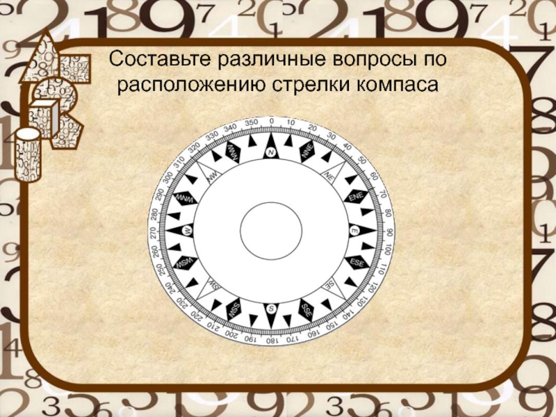 Слайд 12Составьте различные вопросы по расположению стрелки компаса