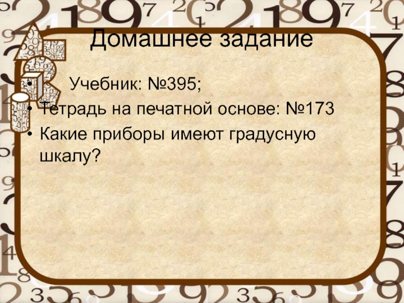 Домашнее задание   Учебник: №395;Тетрадь на печатной основе: №173Какие приборы имеют градусную шкалу?