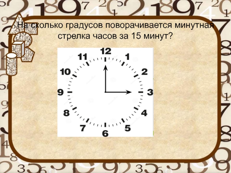 Слайд 9На сколько градусов поворачивается минутная стрелка часов за 15 минут?