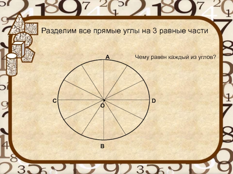 Разделим все прямые углы на 3 равные частиОАВСDЧему равен каждый из углов?