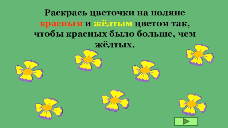 Слайд 29Раскрась цветочки на поляне красным и жёлтым цветом так, чтобы красных