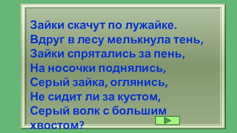 Зайки скачут по лужайке.Вдруг в лесу мелькнула тень,Зайки спрятались за пень,На носочки поднялись,Серый зайка, оглянись,Не сидит ли