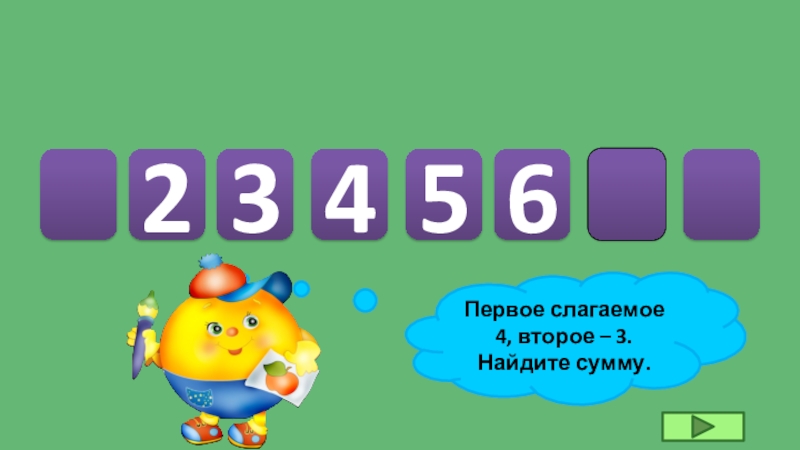 247563Первое слагаемое 4, второе – 3. Найдите сумму.