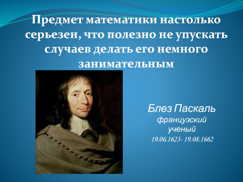 Предмет математики настолько серьезен, что полезно не упускать случаев делать его немного занимательнымБлез Паскальфранцузский ученый19.06.1623- 19.08.1662