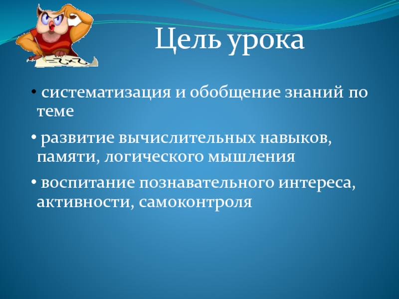 Цель урока систематизация и обобщение знаний по теме развитие вычислительных навыков, памяти, логического мышления воспитание познавательного интереса, активности, самоконтроля