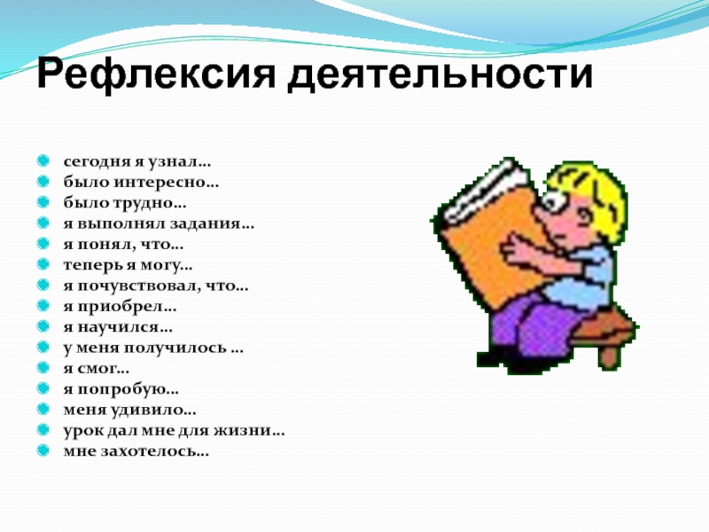 Рефлексия деятельностисегодня я узнал…было интересно…было трудно…я выполнял задания…я понял, что…теперь я могу…я почувствовал, что…я приобрел…я научился…у меня
