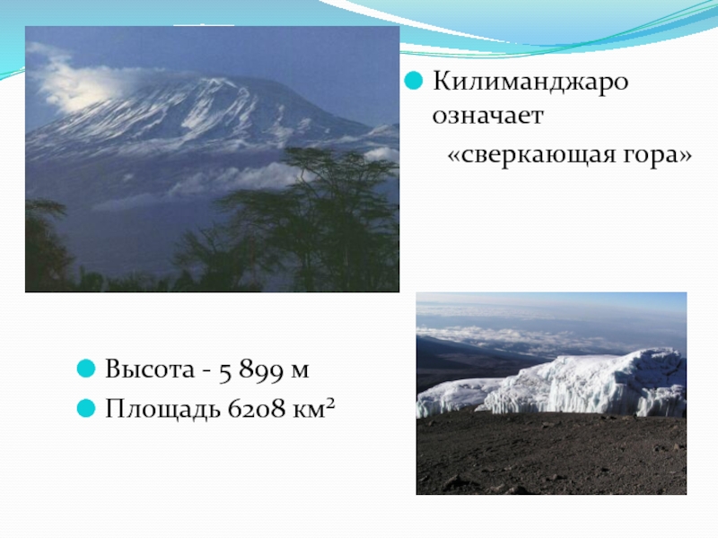 Высота - 5 899 мПлощадь 6208 км² Килиманджаро означает 	«сверкающая гора»
