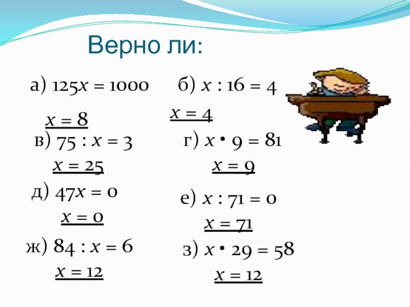 Верно ли:а) 125х = 1000	х = 8 	 б) х : 16 = 4 	х = 4