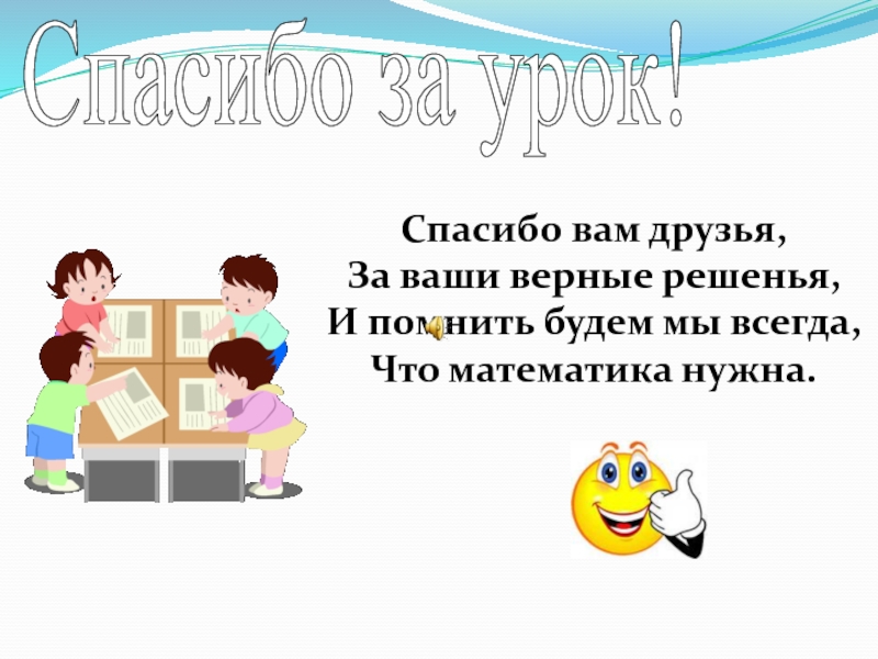 Спасибо за урок!Спасибо вам друзья,За ваши верные решенья,И помнить будем мы всегда, Что математика нужна.