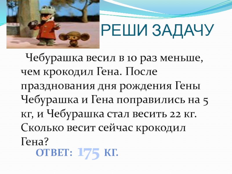 РЕШИ ЗАДАЧУ	Чебурашка весил в 10 раз меньше, чем крокодил Гена. После празднования дня рождения Гены Чебурашка и