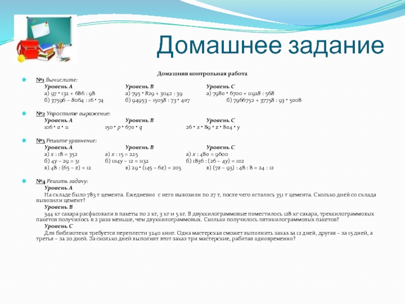 Домашнее заданиеДомашняя контрольная работа№1 Вычислите:			Уровень А			Уровень В			Уровень С	а) 97 • 132 + 686 : 98		а) 795 •