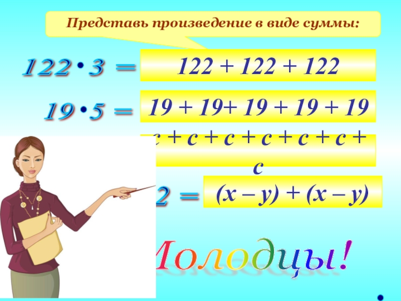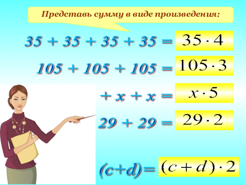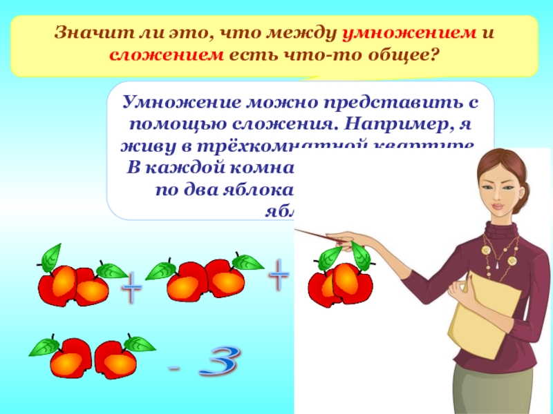 Умножение можно представить с помощью сложения. Например, я живу в трёхкомнатной квартире. В каждой комнате у меня лежит по два яблока. Сколько всего яблок?