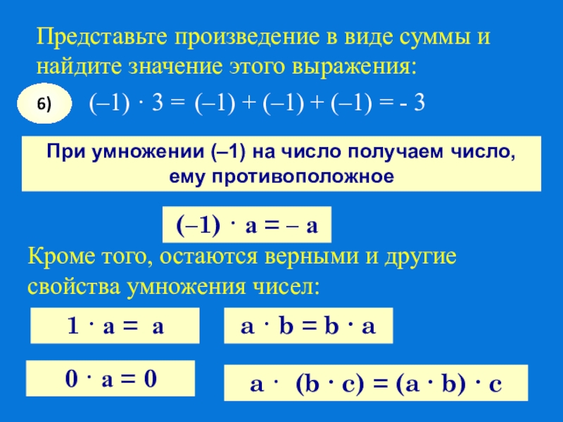 (-6) ∙ (-3) = -6 ∙ (3 ∙ (-1))= ((-6) ∙ 3) ∙ (-1) = - ( (-6) ∙ 3) = = - (-18) = 18