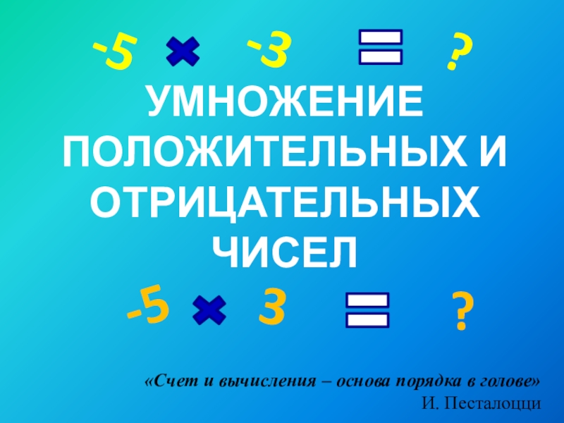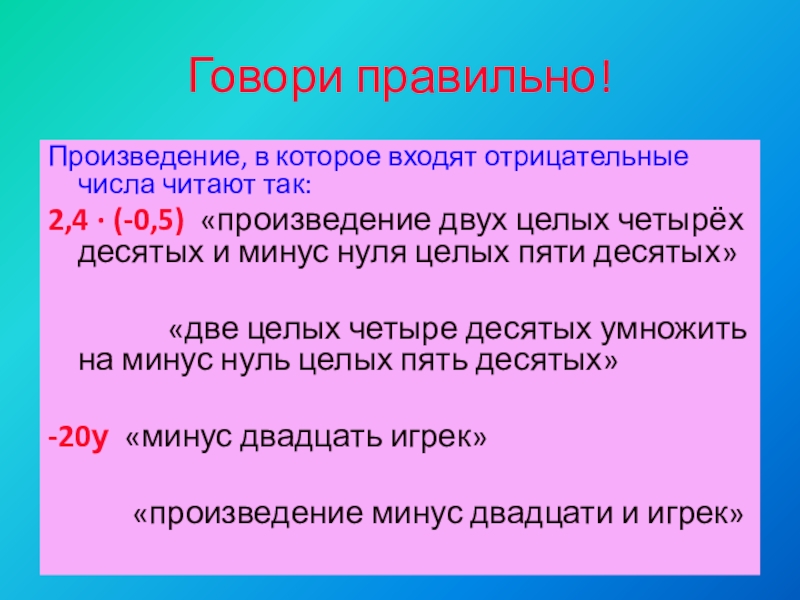 Чтобы перемножить два числа с разными знаками, нужно перемножить их модули и перед произведением поставить знак «-».