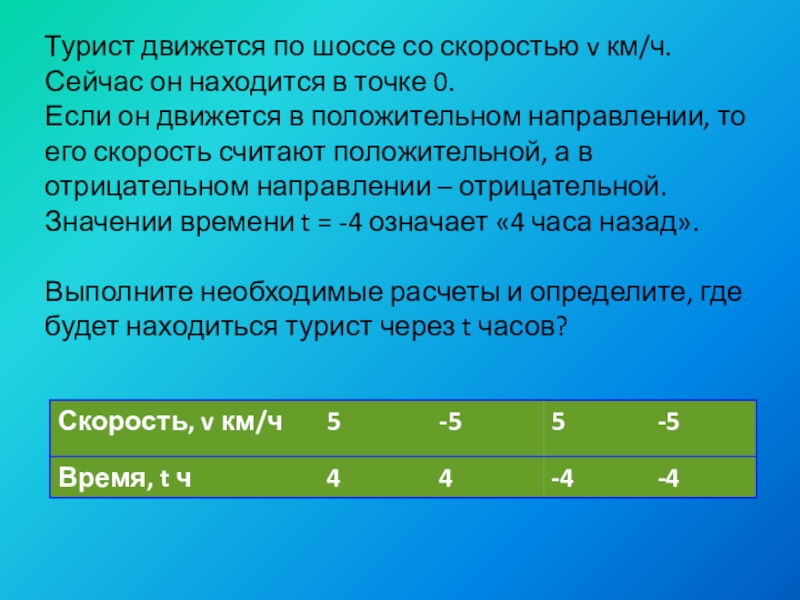 4 часами ранее , двигаясь в положительном направлении, турист находился в точке -20 км
