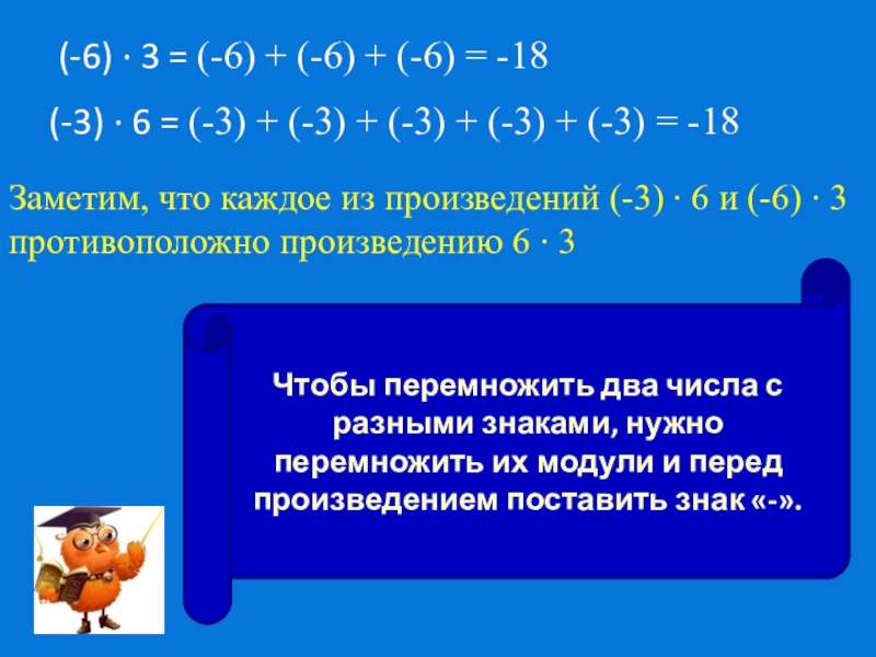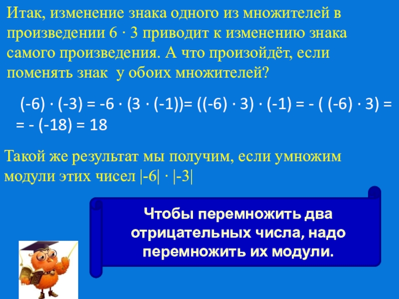 Итак, изменение знака одного из множителей в произведении 6 ∙ 3 приводит к изменению знака самого произведения. А что произойдёт, если поменять знак у обоих множителей?