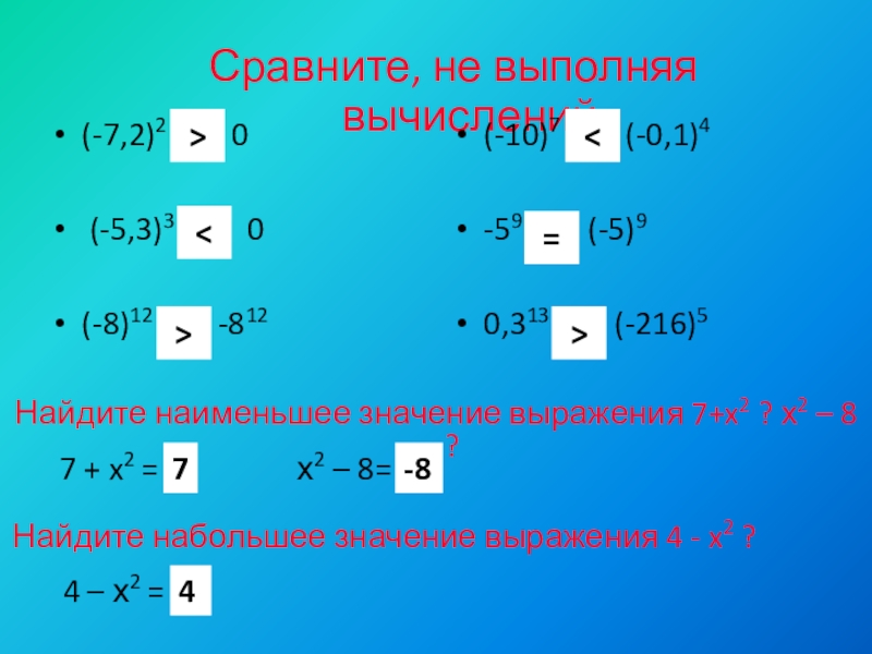 Найдите наименьшее значение выражения 7+x2 ? х2 – 8 ?