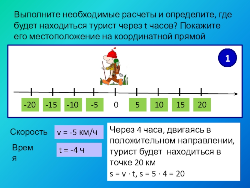 Повернув в обратную сторону, через 4 часа, турист будет находиться в точке -20 км
